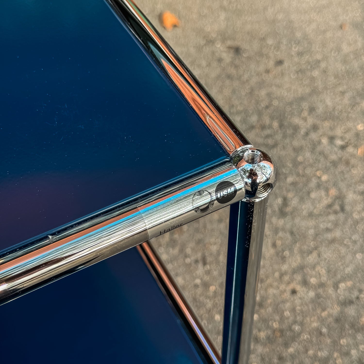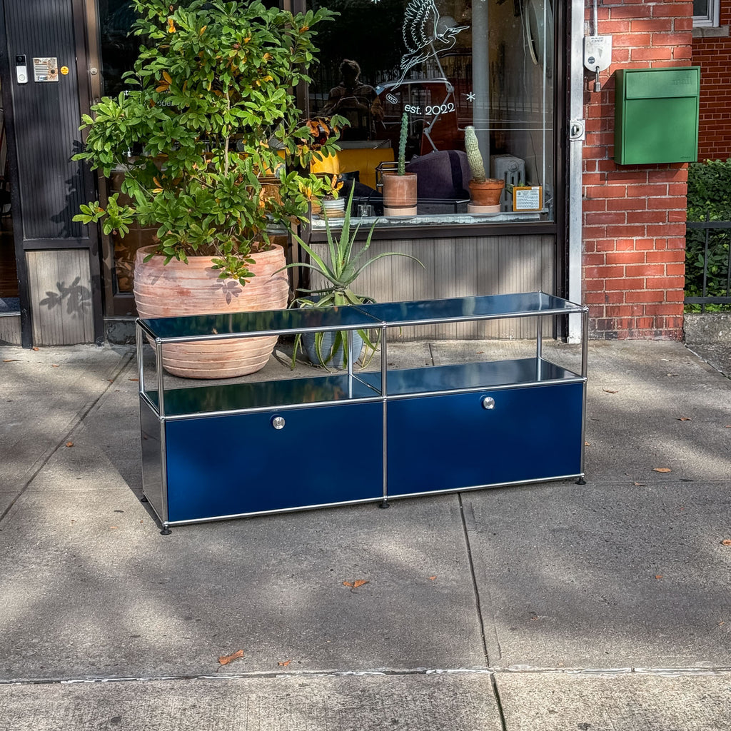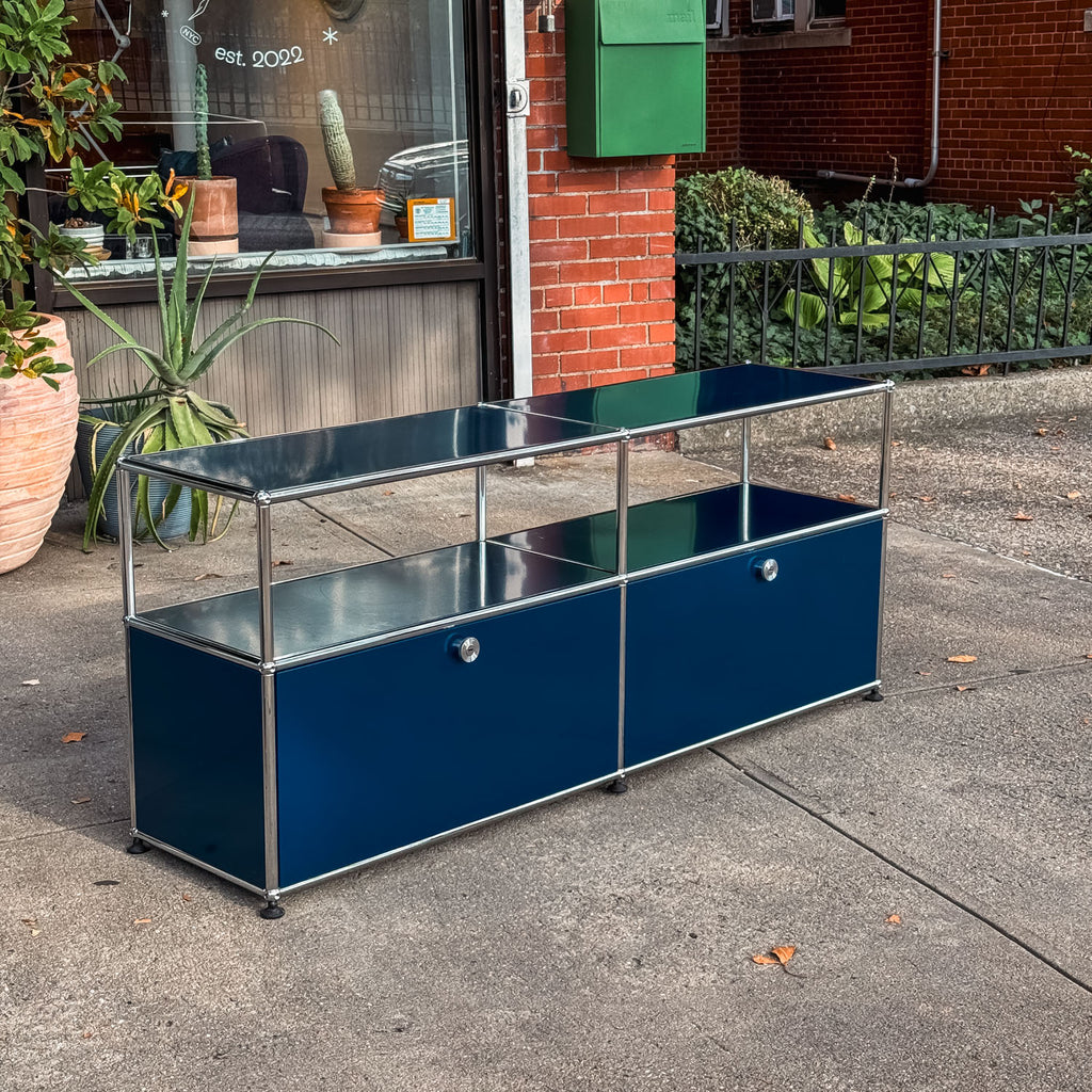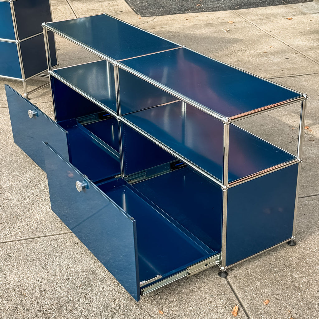 A beautiful USM credenza in steel blue. Powder coated steel panels and chromed tubes. Made in Switzerland by USM.