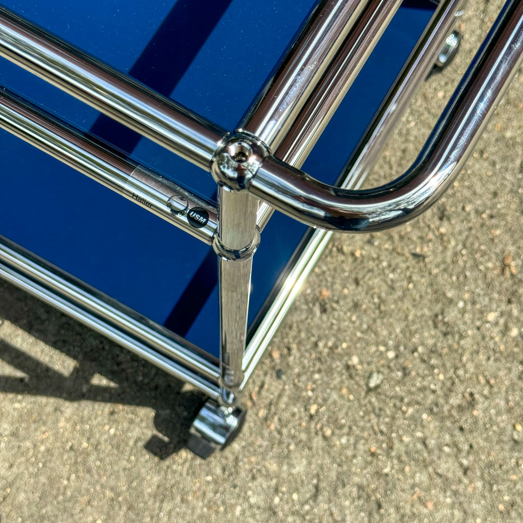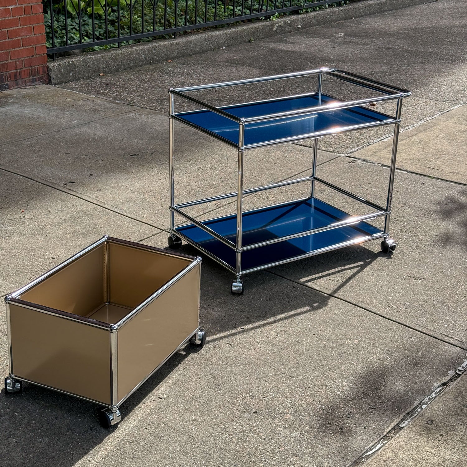 A classic bar cart by USM Haller Modular Furniture in steel blue.