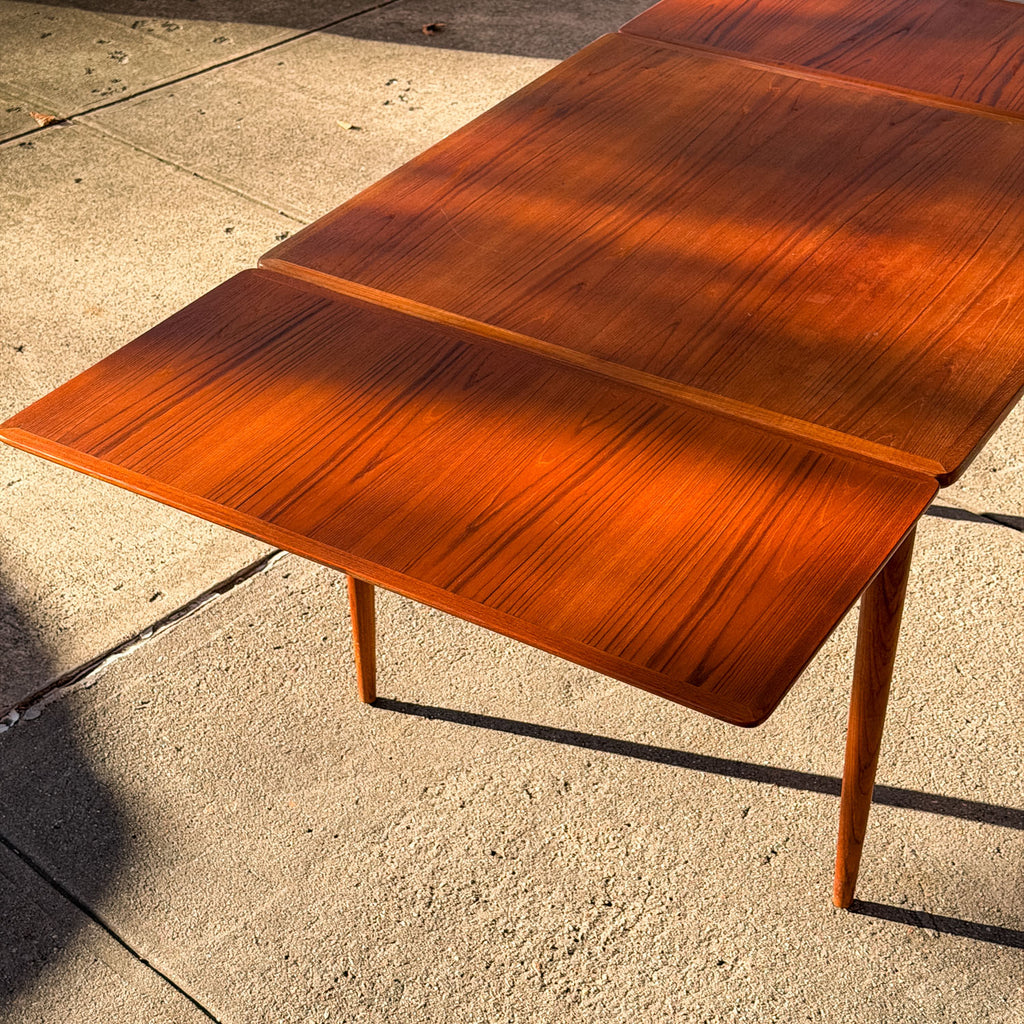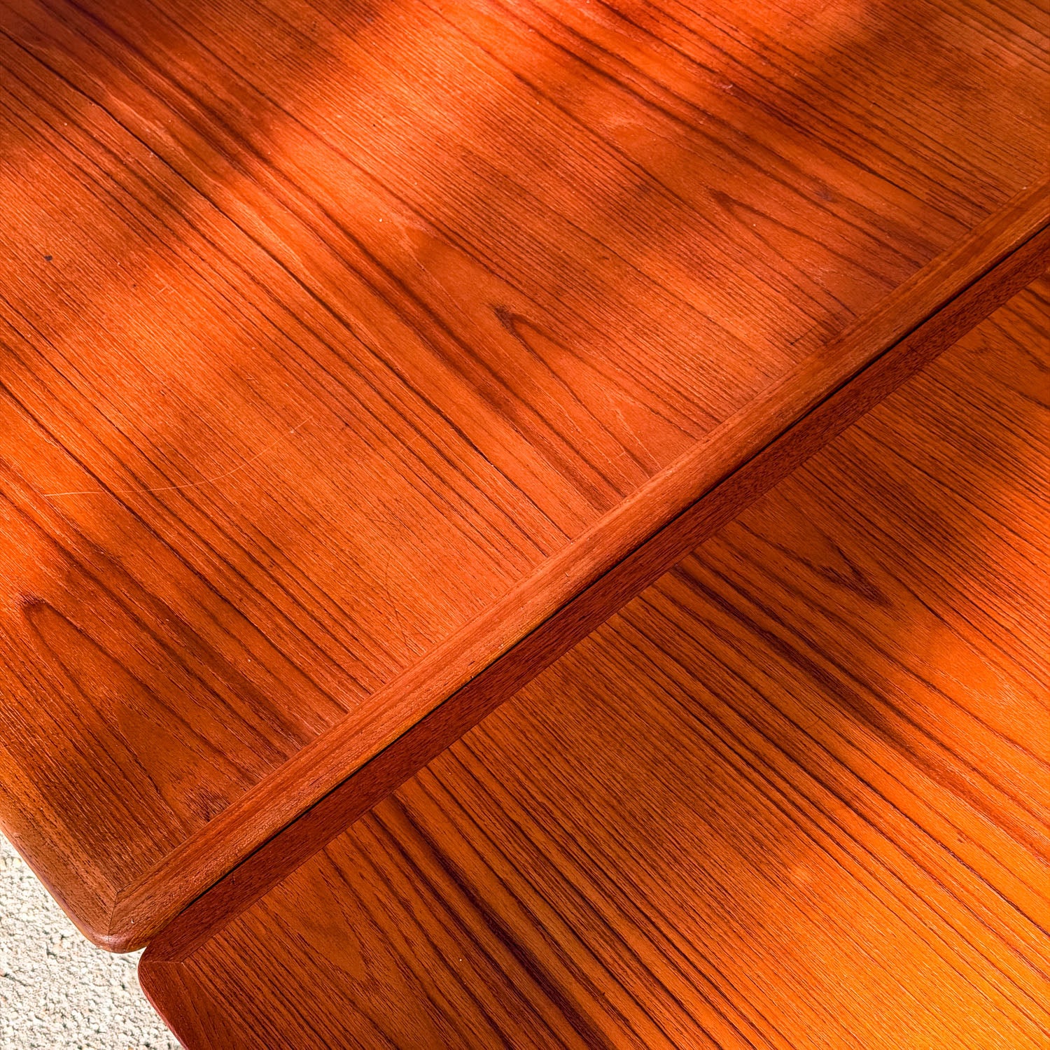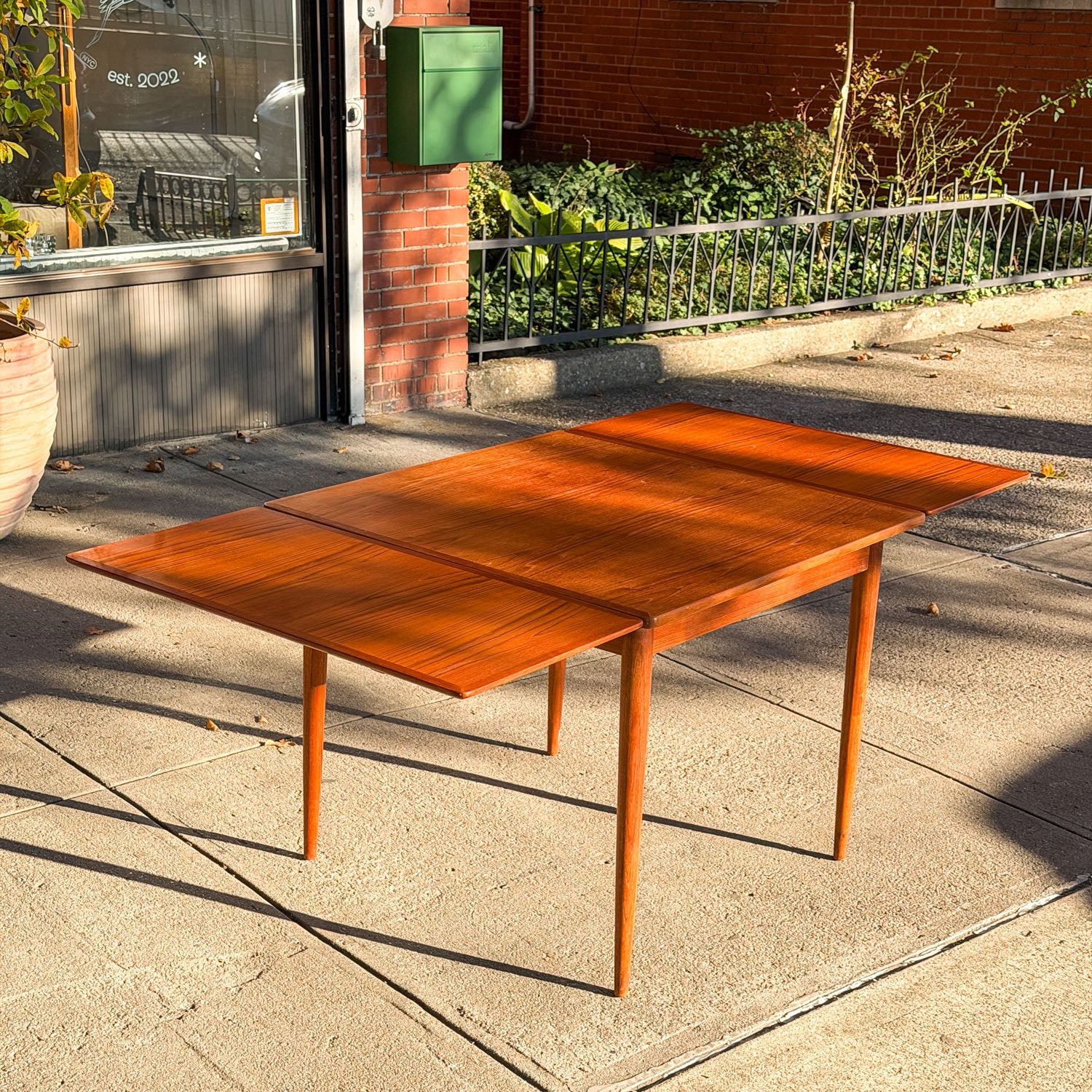 This vintage expandable teak dining table is perfect for smaller spaces. With the self-storing leaves put away, the table is a 35.5" square. With the leaves extended, the table's length increases to 71"