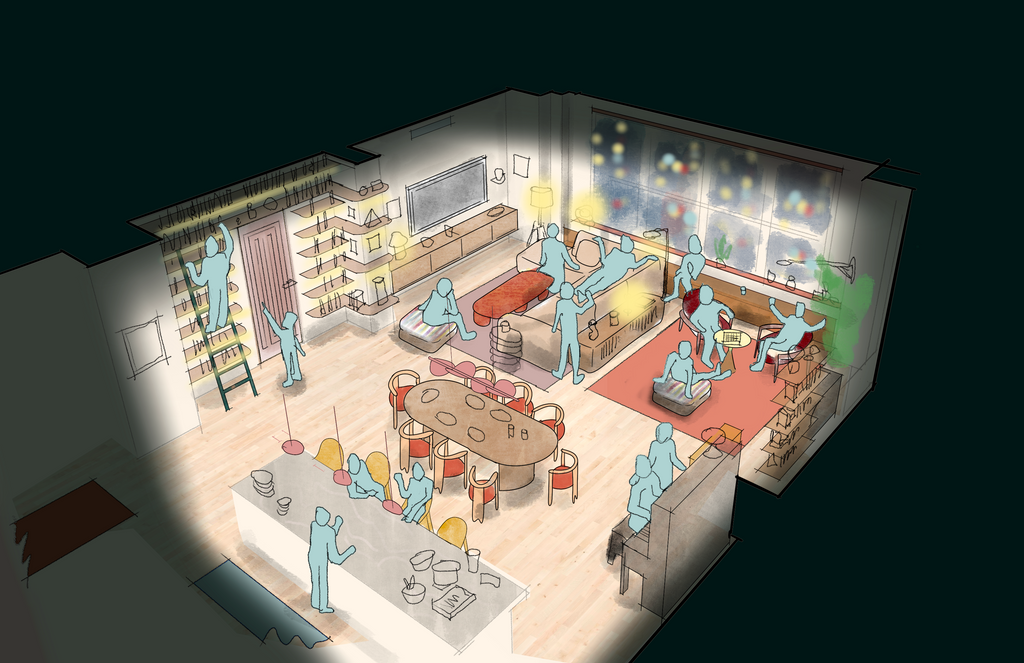This Tribeca residence is a hub for family time and entertaining, with zones for relaxation, play, and gathering that are at both times clearly delineated and seamless. Through its custom millwork and furniture, the space celebrates organic and sculptural forms, craftsmanship, and vibrant materials and colors.