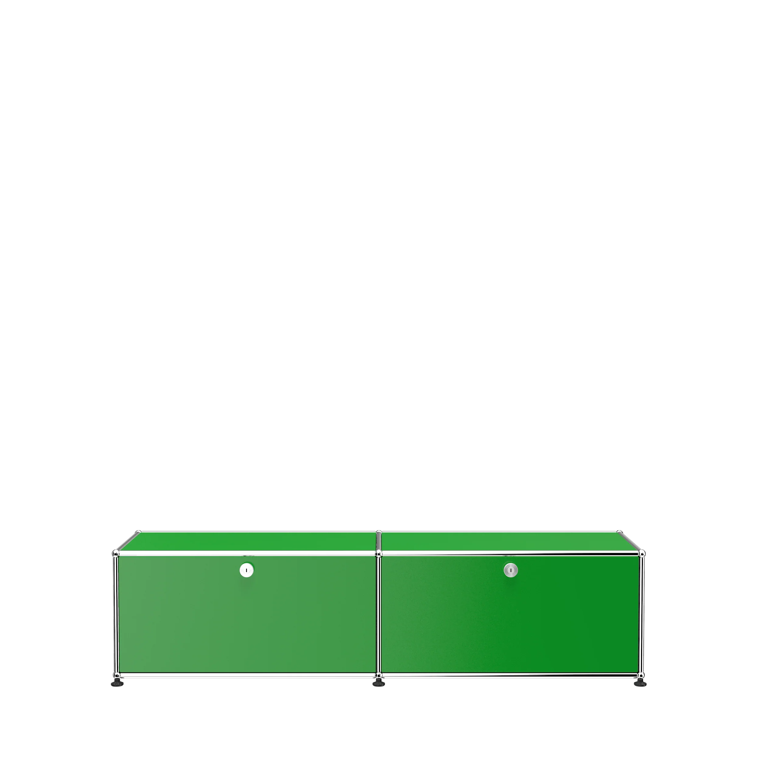 Media storage credenza with two 14"H drop down doors that lock with the twist of a coin. Fitted with one cable cutout.